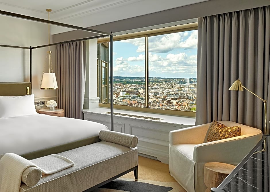 85 sq. m./915 sq. ft., park or city views, 27th floor, living/dining room, Executive benefits Experience a memorable stay in London in one of our Clarence Suites, offering fabulous views of Green Park and the city of London from their 27th floor location. Benefit from Executive Lounge access with complimentary continental breakfast each morning. Each of these suites is unique, offering one-of a-kind features and opulent surroundings. One of the suites has a carved mahogany four-poster bed. All suites offer a separate living room with dining area, and an elegant bathroom, with bidet, bathtub and shower. Amenities include two TVs with BT Sports and on-demand movies, a work desk, complimentary standard WiFi, air conditioning, and a minibar. Special touches include bathrobes and slippers. Sleeps 4 (third and fourth persons on a rollaway bed). This suite can be connected to an Executive room to create a two-bedroom suite. View Floor Plan